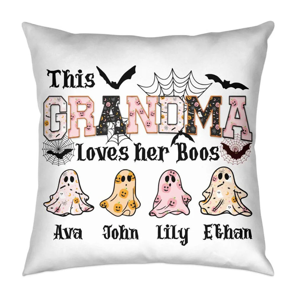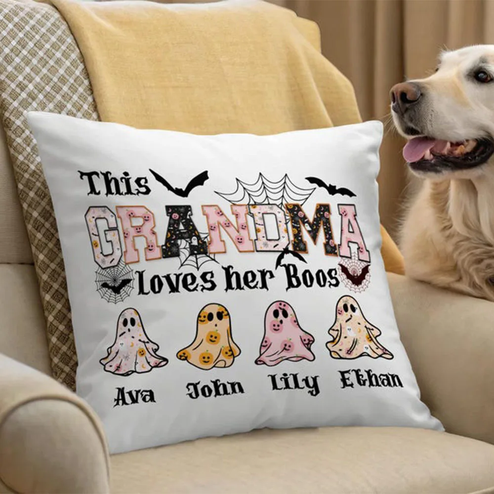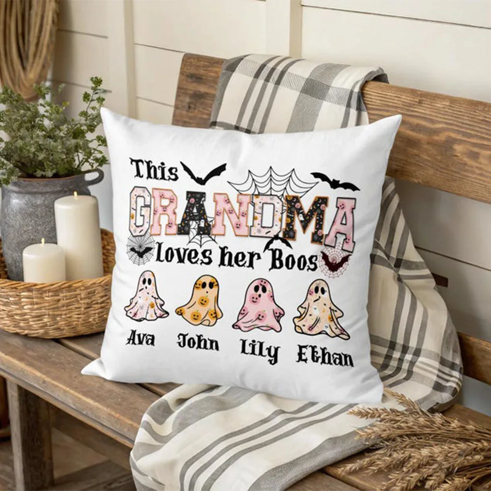 Add cozy festive vibes to her home with this custom pillow featuring cute ghosts bats spider webs smiling pumpkins and stars plus her grandkids’ names for extra sentiment.🌟